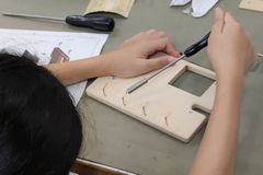 用意されている木の板に必要な金具を取り付けてます。 まずは、紙やすりで板をすべすべにして、さらにワックスを塗りこんでいきます。 電子回路基板を取り付けつための鬼目ナットをトンカチで打ち込んで、上部に紐を取り付けます。 最後は、キーを引っ掛ける洋折釘をねじ込んでいきます。